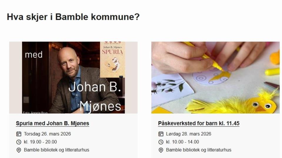 Lurer du på hva som skjer i Bamble? Det blir nå enklere å få oversikt over hva som skjer i Bamble. En ny kalenderfunksjon på kommunens nettside samler tilbud og arrangementer – både komm... Publisert 25.03.2026 kl. 14.17